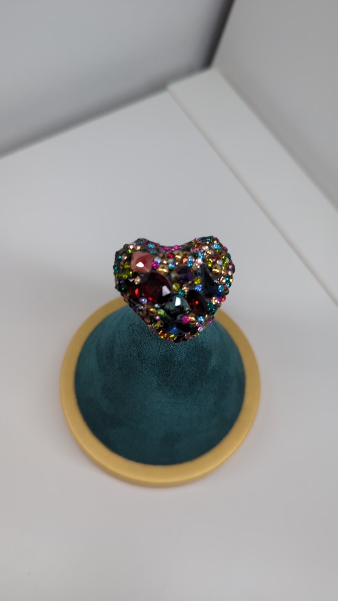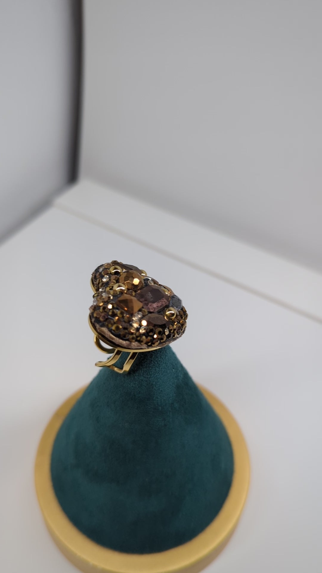 Espectacular diseño voluminoso en forma de corazón, repleto de cristales en tonos tierra y ámbar. Su base de acero inoxidable dorado garantiza resistencia al agua y un brillo duradero sin alergias.