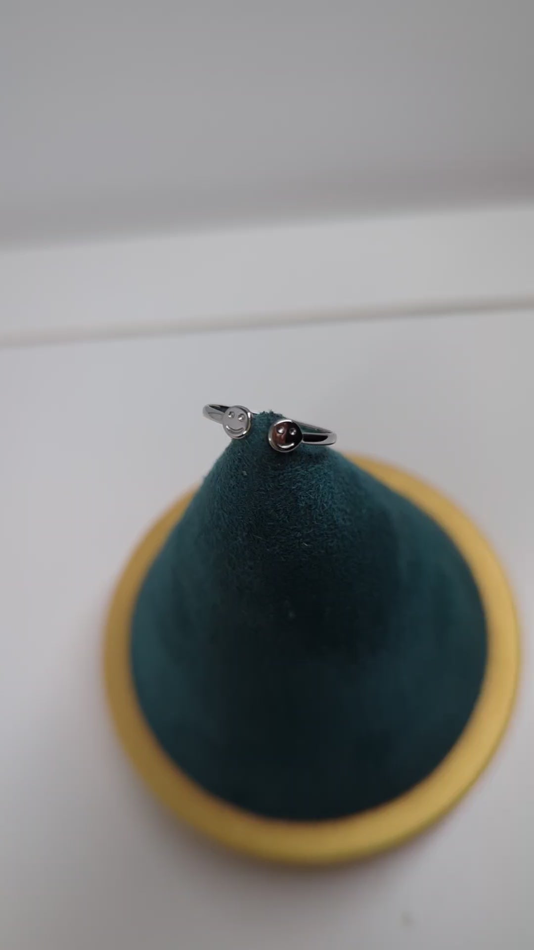 Anillo abierto y ajustable de acero inoxidable plateado, decorado con dos pequeñas caritas sonrientes . Un diseño juvenil y desenfadado, perfecto para transmitir alegría y positividad en tu día a día.