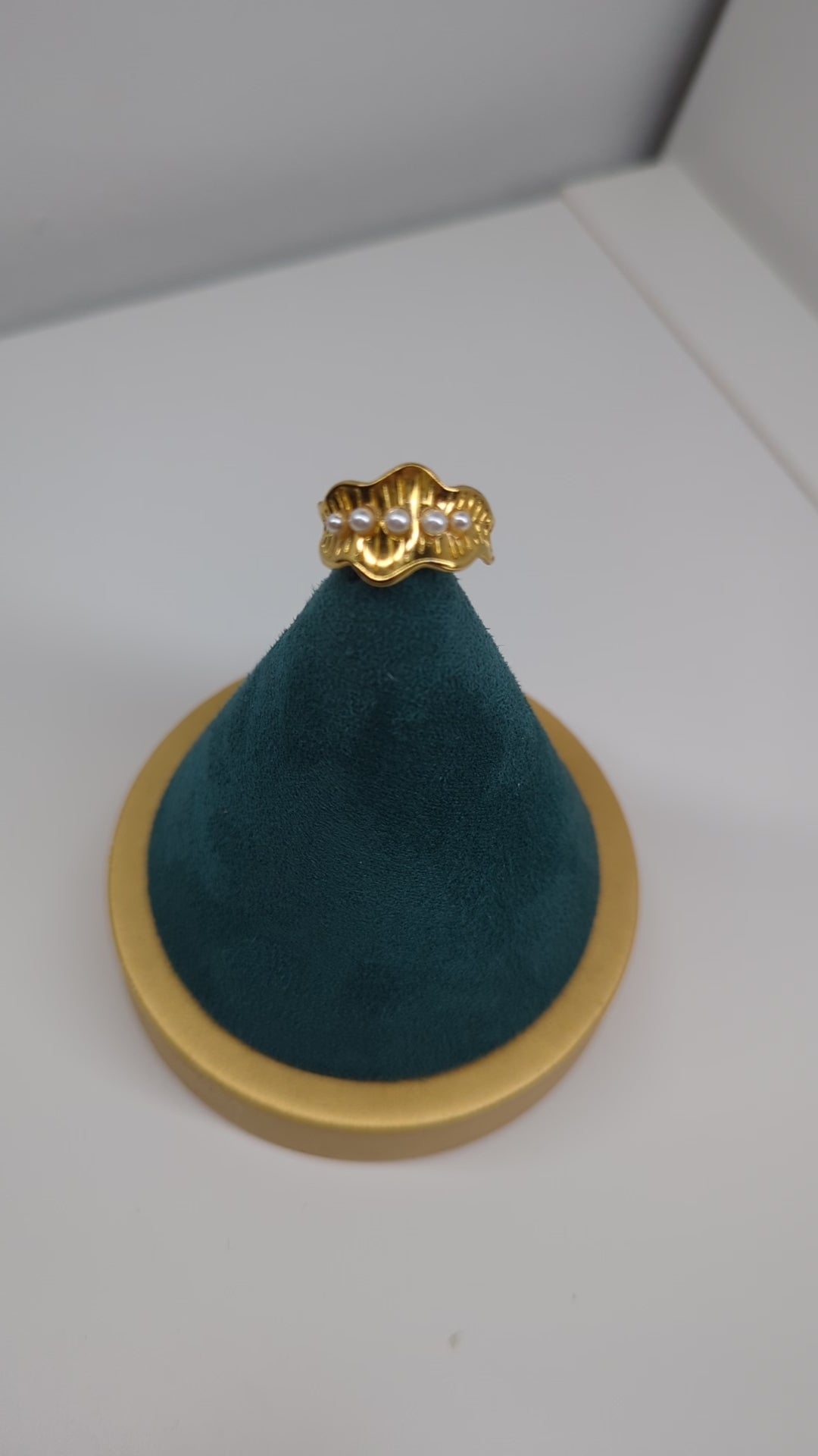 Siente el mar en tus manos. Diseño ondulado en acero dorado que acuna una fila de perlas blancas. Fresco, elegante y totalmente resistente al agua.