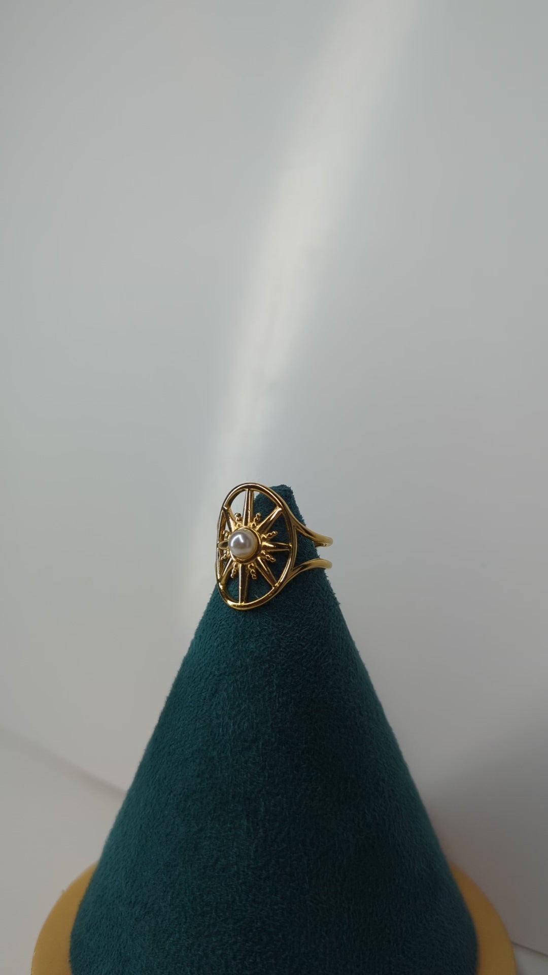 Inspirado en los misterios del cosmos, este anillo de acero dorado presenta una estructura circular calada con un sol radiante en su interior. En el corazón de la pieza descansa una delicada perla central que simboliza la luz de la luna. Su diseño mÃstico y elegante lo convierte en un amuleto perfecto para el dÃa a dÃa.